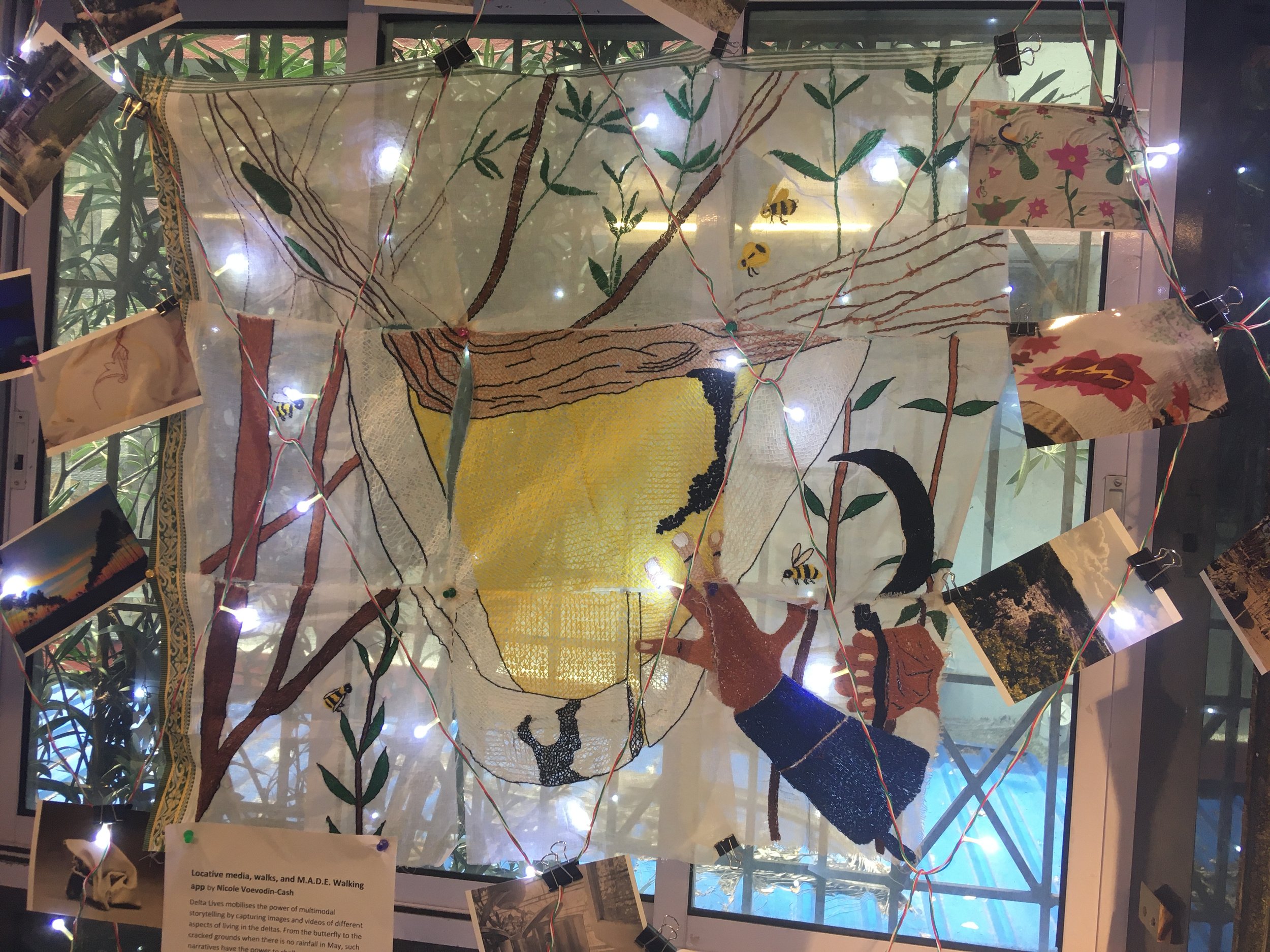 Textile art of women community members from the archipelago of Sundarbans depicting the process of honey collection from bee-hives. Exhibited at Delta Lives Exhibition, 2022.